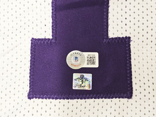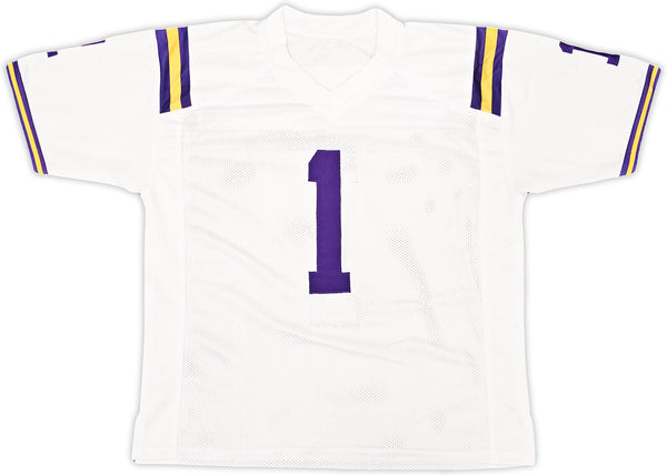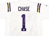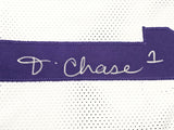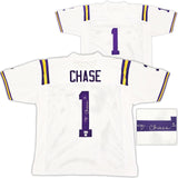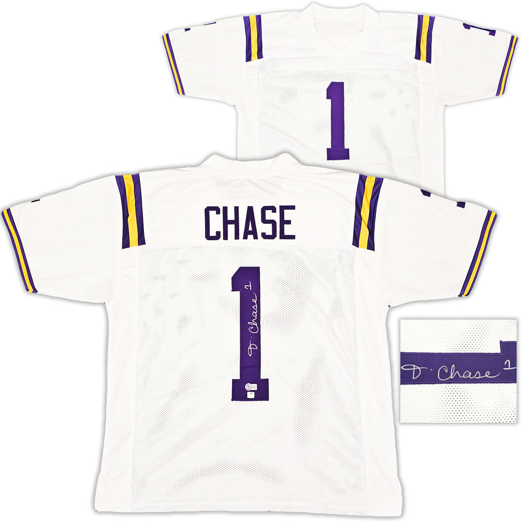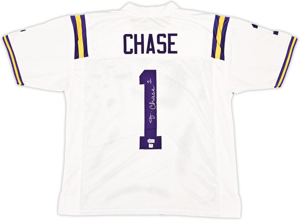 This is a White Jersey that has been hand signed by Ja'Marr Chase. This is a custom jersey with no name brand. The approximate size is XL. It has nice sewn in name and numbers. This item has been witnessed and certified authentic by Beckett Authentication (BAS) and comes with their tamper-proof witness sticker.