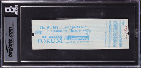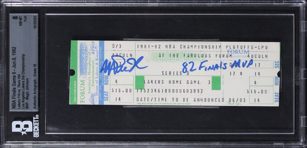 This Autographed Ticket Graded EX-MT 8, Auto Graded Gem Mint 10! June 8, 1982 Game 6 Full Ticket Stub with the inscription of "82 Finals MVP" has been Personally Signed by Magic Johnson of the Los Angeles Lakers. This item is 100% Authentic, it comes slabbed and authenticated by Beckett Authentication Services. The authenticity can be verified on Beckett Authentication Services website.
