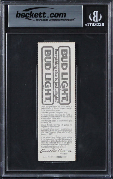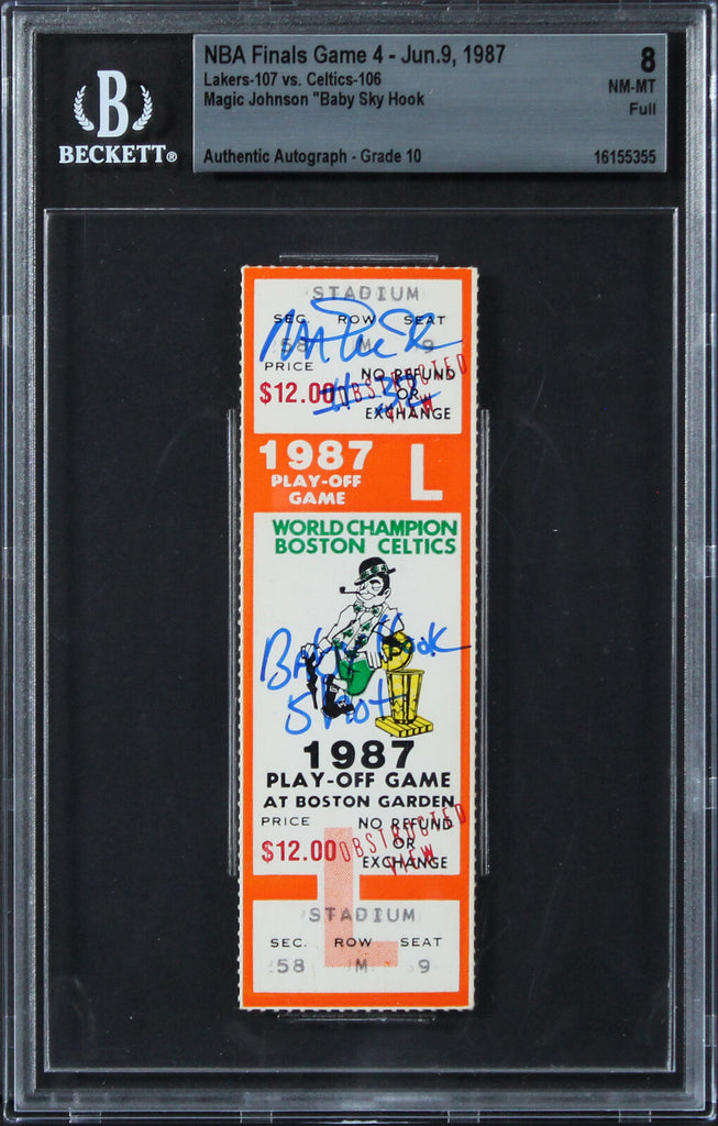 This Autographed Ticket Graded EX-MT 8, Auto Graded Gem Mint 10! June 9, 1987 NBA Finals Game 4 Vs Celtics Ticket Stub with the inscription of "Baby Hook Shot" has been Personally Signed by Magic Johnson of the Los Angeles Lakers. This item is 100% Authentic, it comes slabbed and authenticated by Beckett Authentication Services. The authenticity can be verified on Beckett Authentication Services website.