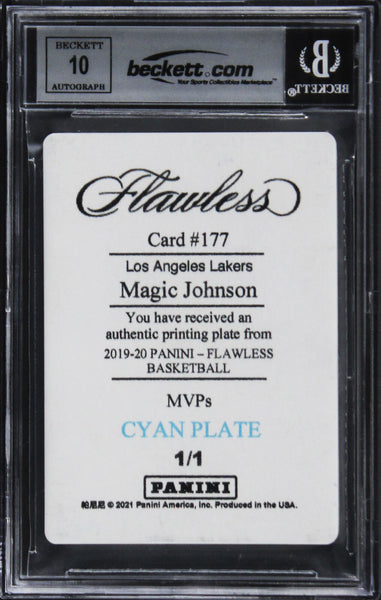 This Autographed Auto Graded Gem Mint 10! 2019 Panini Flawless MVPS Printing Plates Cyan #177 1/1 Card has been Personally Signed by Magic Johnson of the Los Angeles Lakers. This item is 100% Authentic, it comes slabbed and authenticated by Beckett Authentication Services. The authenticity can be verified on Beckett Authentication Services website.