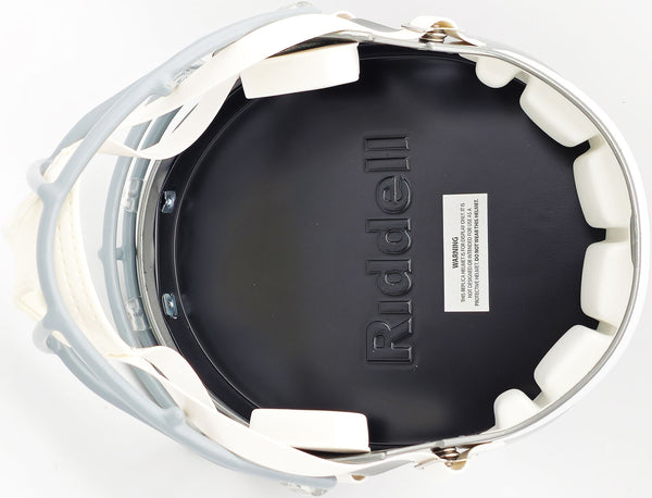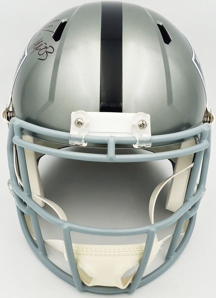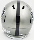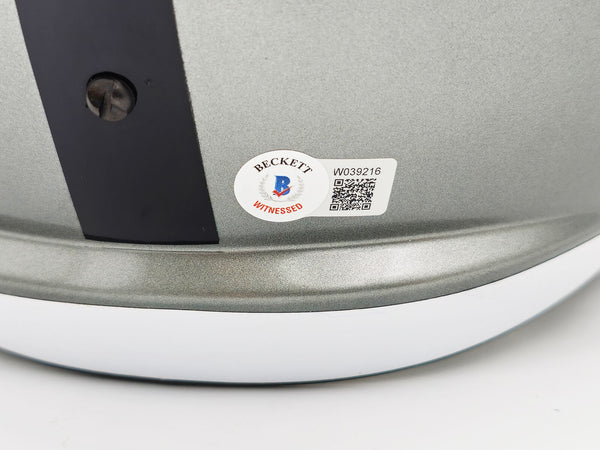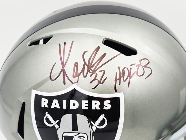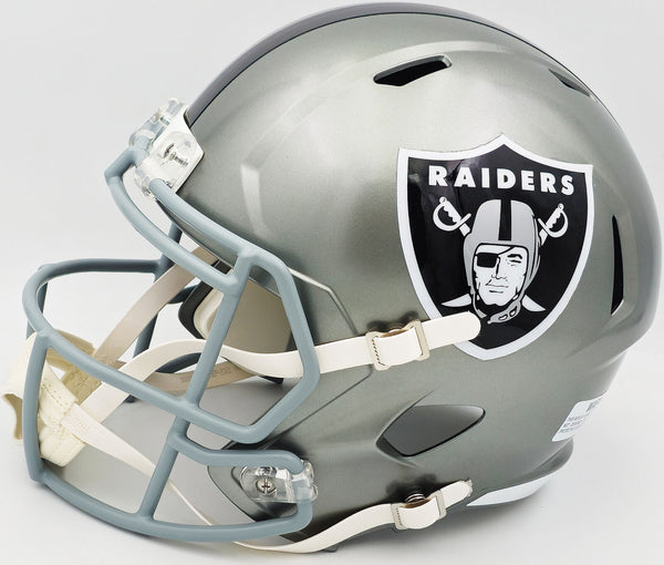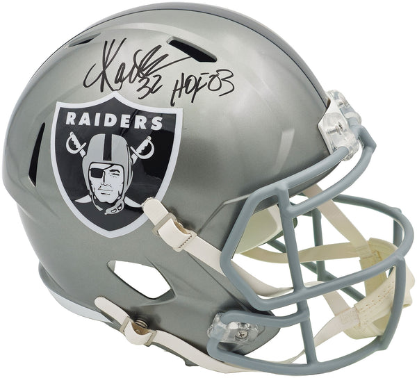 This is a Los Angeles Raiders Flash Silver Full Size Replica Speed Helmet that has been hand signed by Marcus Allen. The Flash helmets are delicate and may have some marks or scratches on them. This item was inscribed "HOF 03." This item has been witnessed and certified authentic by Beckett Authentication (BAS) and comes with their tamper-proof witness sticker.