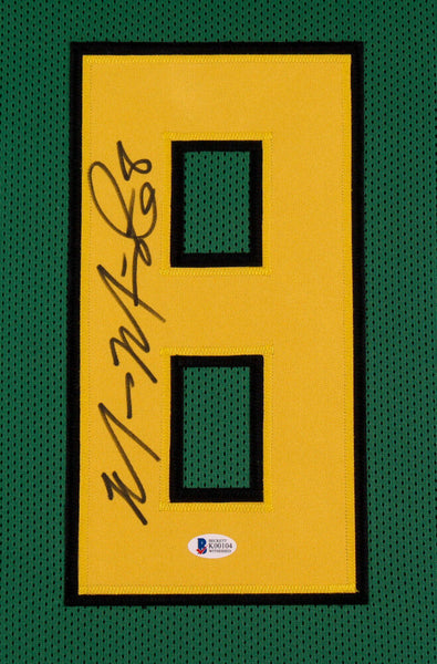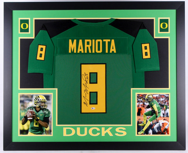 Custom frame measures approximately 35" x 43" in size and features a jersey which has been hand-signed in black felt tip pen by Marcus Mariota. Includes an official Beckett Authentication Services serially numbered hologram and matching COA for authenticity purposes. The signing of this item was witnessed by BeckettAuthentication: Beckett COA