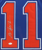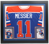 Custom frame measures approximately 31" x 35" in size and features a jersey which has been hand-signed in silver paint pen by Mark Messier (HOF). Includes an official James Spence Authentication (JSA) hologram and matching COA for authenticity purposes.Authentication: JSA COA
