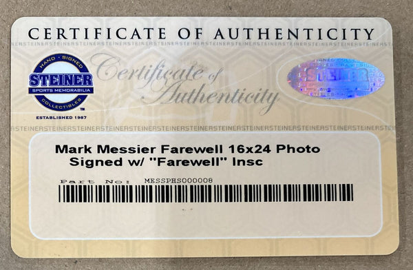 Featured is a Mark Messier signed 16x20 photo. This photo has been hand signed by Messier and inscribed "Farewell". This photo comes with the Steiner Sports hologram and certificate of authenticity. This photo has been professionally framed and matted and is approximately 11x14. This photo would make a great addition to any sports memorabilia collection! SPECIFICATIONS Autographed By: Mark Messier Team: New York Rangers Sport: Hockey-NHL Authentication: Steiner Sports