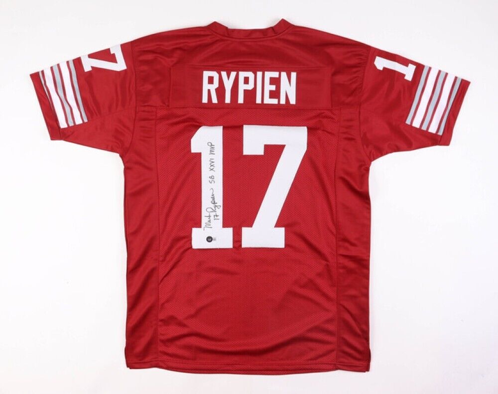 Custom on-field style jersey. Everything is sewn on, size XL. Hand-signed and inscribed by Mark Rypien.The lot / autograph(s) includes an official Beckett Authentication Services serially numbered hologram for authenticity purposes. The signing of this item was witnessed by Beckett.Authentication: Beckett Hologram
