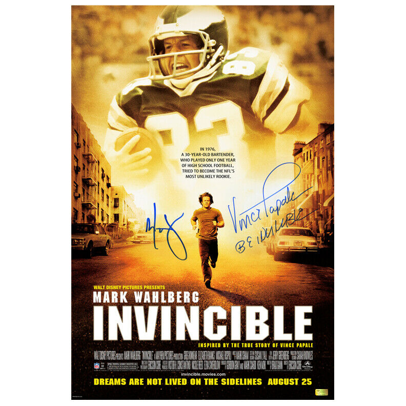 This Invincible 16x24 Movie Poster of Mark Wahlberg as Vince Papale has been personally hand-signed by Mark and Vince during their signings with Celebrity Authentics with Vince adding a "Be Invincible" inscription. Invincible was nominated for two awards and features Mr. Wahlberg as Philadelphia Eagles walk-on Vince Papale and costars Greg Kinnear and Elizabeth Banks. Ships affixed with Celebrity Authentics serial-numbered and tamper evident Authentication Hologram and includes Celebrity Authentics Certificate of Authenticity featuring picture of Mark and Vince signing poster. Please note: with multiples signed by the actor, a sample photo is used from stock to represent what you will receive. Exact autograph size and placement may vary.