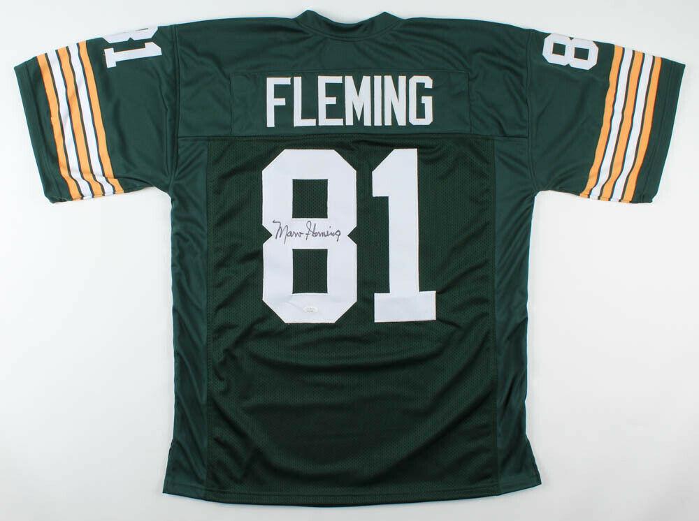 Custom on-field style jersey. Everything is sewn on, size XL. Hand-signed and inscribed in black felt-tip pen by Marv Fleming. The lot / autograph(s) includes an official James Spence Authentication (JSA) hologram and matching COA for authenticity purposes. The signing of this item was witnessed by JSA.Authentication: JSA COA