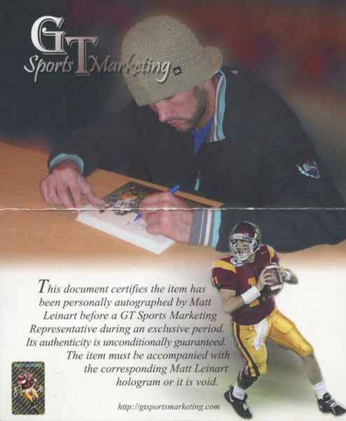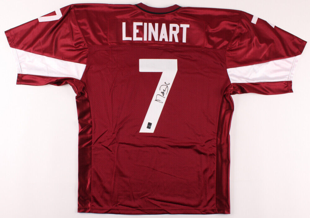Custom on-field style jersey. Everything is sewn on, size XL. Hand-signed in black paint pen by Matt Leinart (Arizona Cardinals, Houston Texans, Oakland Raiders, Buffalo Bills). The lot / autograph(s) includes an official Matt Leinart player hologram for authenticity purposes.Authentication: Leinart Hologram