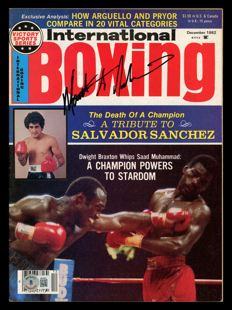 This is a International Boxing Magazine that has been hand signed by Matthew Saad Muhammad. There is an imperfection in the signature as shown. This item has been certified authentic by Beckett Authentication (BAS) and comes with their tamper-proof QR Code hologram that can be verified on the Beckett-authentication.com.