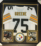 Custom frame measures approximately 36" x 39" in size and features a jersey which has been hand-signed in black felt-tip pen by Joe Greene (HOF). The autograph includes an official Professional Autograph Authentication Service (PAAS) hologram and matching COA for authenticity purposes.Authentication: Professional Autograph Authentication Service (PAAS)