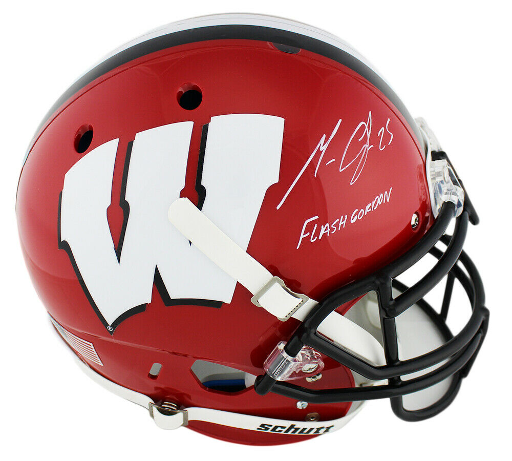 A Wisconsin Badgers Schutt Authentic Red & Black NCAA Helmet Hand Signed By Melvin Gordon. The signatures and item are in excellent condition. In addition to signing his name, Melvin also inscribed "Flash Gordon" on the item. Melvin is a NFL running back for the L.A. Chargers, he was drafted first round in the 2015 Draft by the Chargers. He is a 2x Pro Bowler. Melvin played football in College at the University of Wisconsin, he was Big Ten Offensive Player of the Year in 2014. AUTHENTICATION: The item is accompanied by a Melvin Gordon Exclusive Certificate of Authenticity & Hologram - Serial Numbered and Databased Hologram - Picture of Melvin from the signing.