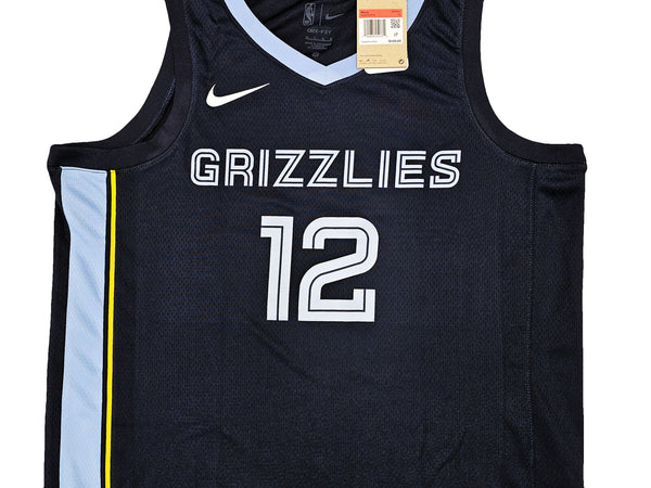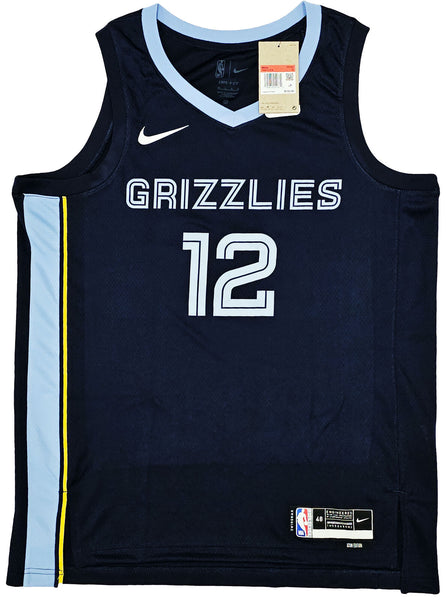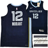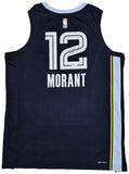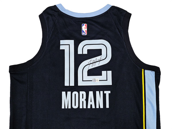 This is a Dark Blue Nike Memphis Grizzlies Icon Edition Swingman Jersey that has been hand signed by Ja Morant. This jersey is Size 48. This item has been certified authentic by Beckett Authentication (BAS) and comes with their tamper-proof QR Code sticker that can be verified on beckett-authentication.com.