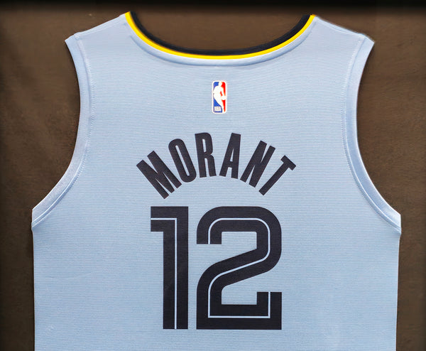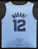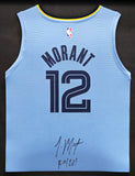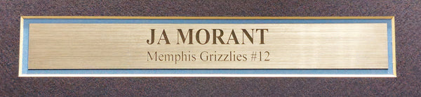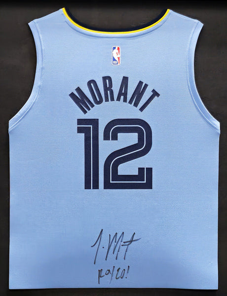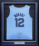 This is a framed Light Blue Fanatics Memphis Grizzlies Jersey, approximately 31x36 with the frame, that has been hand signed by Ja Morant. This item was inscribed "ROY 20." This item has been certified authentic by Beckett Authentication (BAS) and comes with their tamper-proof QR Code sticker that can be verified on beckett-authentication.com.