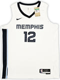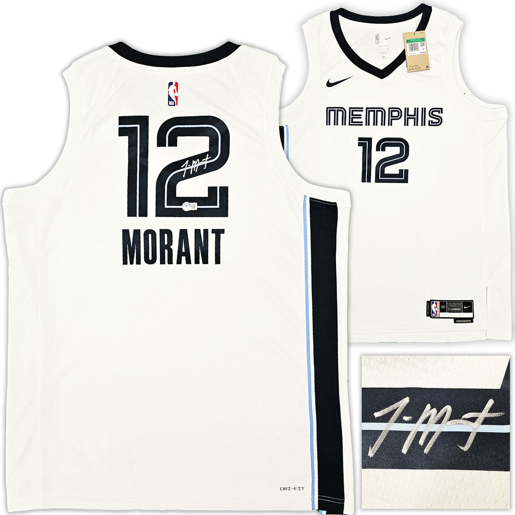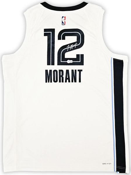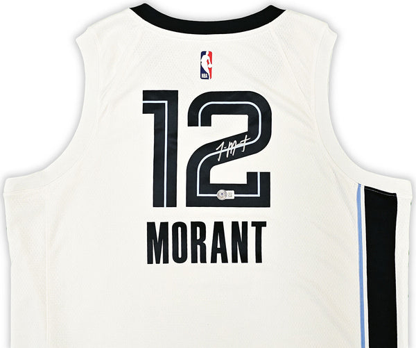 This is a White Nike Memphis Grizzlies Association Edition Swingman Jersey that has been hand signed by Ja Morant. This jersey is Size 52. This item has been certified authentic by Beckett Authentication (BAS) and comes with their tamper-proof QR Code sticker that can be verified on beckett-authentication.com.