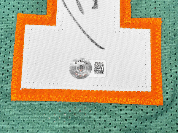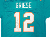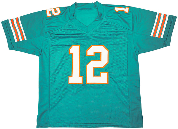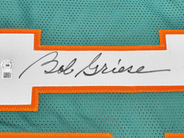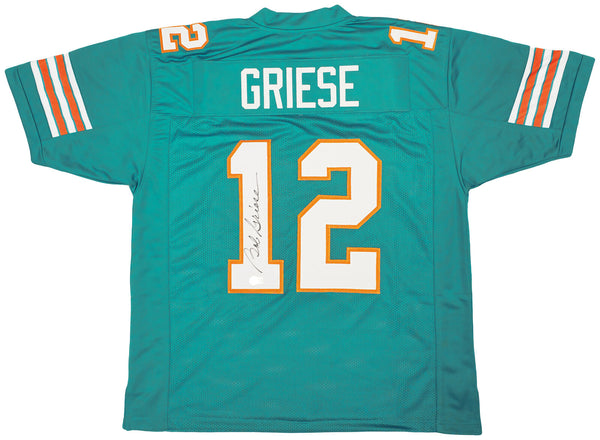 This is a Teal Jersey that has been hand signed by Bob Griese. This is a custom jersey with no name brand. The approximate size is XL. It has nice sewn in name and numbers. This item has been witnessed and certified authentic by Beckett Authentication (BAS) and comes with their tamper-proof witness sticker.