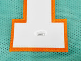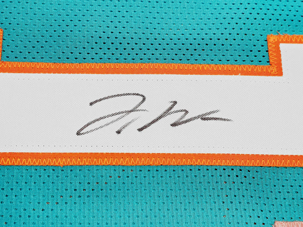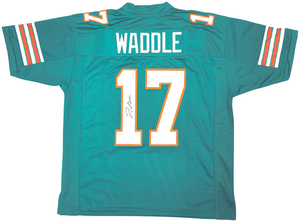 This is a Teal Jersey that has been hand signed by Jaylen Waddle. This is a custom jersey with no name brand. The approximate size is XL. It has nice sewn in name and numbers. This item has been certified authentic by JSA and comes with their tamper-proof sticker and matching certificate of authenticity.