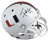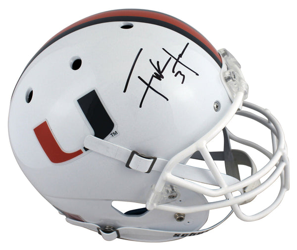 This Autographed White Schutt Full Size Rep Helmet has been Personally Signed by Frank Gore of the Miami Hurricanes. This item is 100% Authentic to include a Certificate of Authenticity (COA) / hologram by Beckett Authentication Services. This is a BAS Witnessed Protection Program item which means a Beckett Authentication Service representative was present when this item was being signed. This is a stock item. We conducted an autograph signing with Frank Gore and we have several of these available. The one you will receive will be of equal quality to the one pictured. This item can be verified through BAS Witnessed.