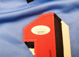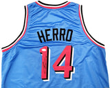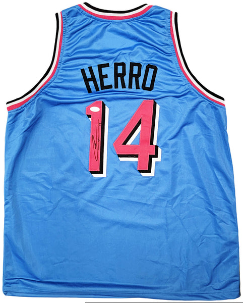 This is a Blue Jersey that has been hand signed by Tyler Herro. This is a custom jersey with no name brand. The approximate size is XL. It has nice sewn in name and numbers. This item has been certified authentic by JSA and comes with their tamper-proof sticker and matching certificate of authenticity.