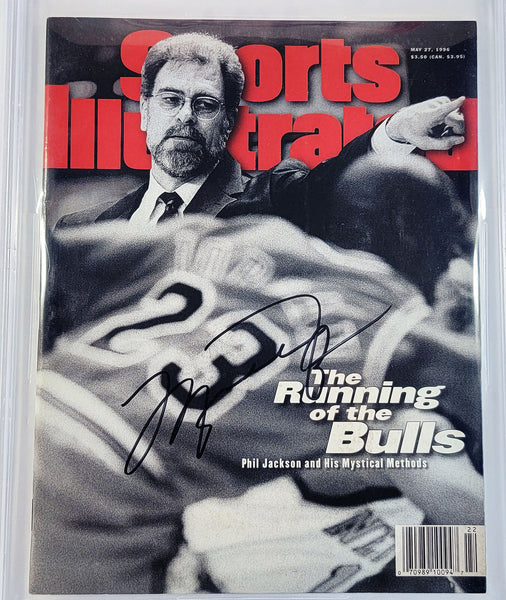 This is a Sports Illustrated Magazine 1996 Issue that has been hand signed by Michael Jordan. The condition of the signature was graded a Near Mint/Mint 8 by Beckett BAS. It has been certified authentic by Beckett Authentication Services (BAS) and comes encapsulated in their tamper-proof holder.