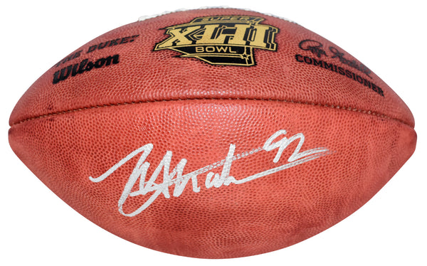 Michael Strahan, former Hall of Fame defensive end for the New York Giants, has hand signed this official Super Bowl XLII Wilson football at a private signing. This item comes with a certificate of authenticity (COA) from JSA - James Spence Authentication and was signed in the presence of one of their representatives. You will receive a serial-numbered COA along with a matching serial-numbered sticker on the ball. The authenticity can be verified online by entering the serial number.Item pictured may not be the exact item you will receive. It will be similar quality, and we guarantee your satisfaction.