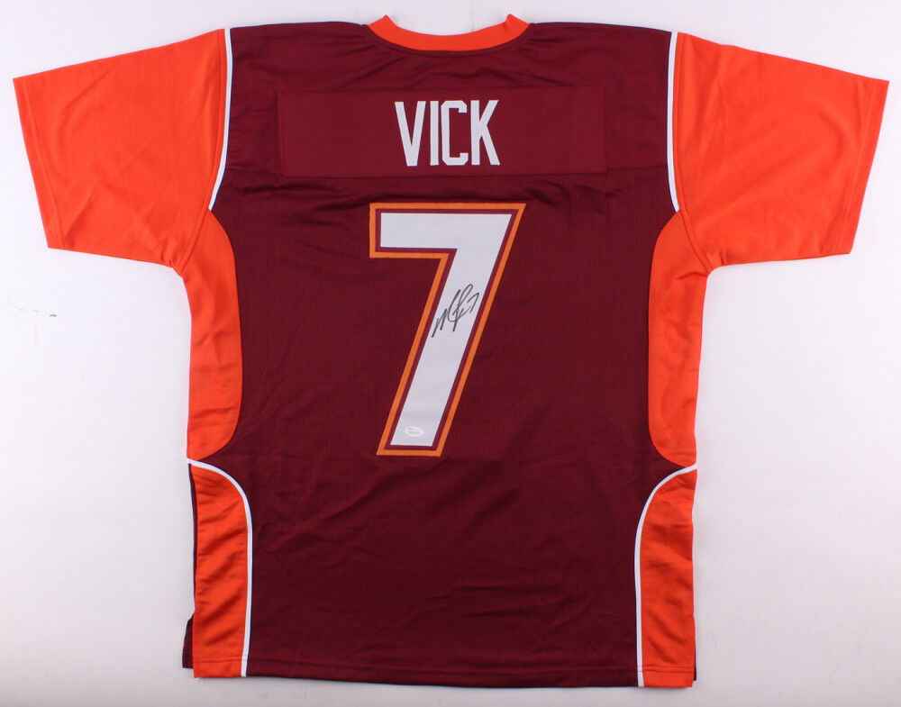 Custom on-field style jersey. Everything is sewn on, size XL. Hand-signed in black felt-tip pen by Michael Vick (Falcons). The lot / autograph(s) includes an official James Spence Authentication (JSA) hologram and matching COA for authenticity purposes. The signing of this item was witnessed by JSA.Authentication: JSA COA