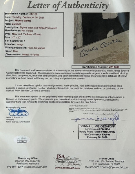 Mickey Mantle Autographed 16x20 Photo - Professionally Framed Own a piece of baseball immortality with this stunning Mickey Mantle autographed 16x20 photograph, professionally framed and ready to display. This museum-quality piece features "The Commerce Comet" himself and comes with full authentication. Product Specifications: Authentic Signature: Hand-signed by Mickey Mantle JSA Authenticated: Includes James Spence Authentication Letter of Authenticity Premium Framing: Professionally framed at 27.5" x 24" dimensions Photo Size: High-quality 16x20 inch photograph Ready to Display: Arrives framed and ready to hang Hall of Fame Legend: Features the Yankees' greatest switch-hitter About Mickey Mantle: Mickey Mantle remains one of baseball's most beloved legends. The Hall of Fame center fielder's incredible power from both sides of the plate, combined with his speed and charisma, made him a true icon of America's pastime. His 536 career home runs and Triple Crown season in 1956 cemented his legacy as one of the greatest Yankees of all time. Display & Investment Value: This professionally framed piece is perfect for your home office, man cave, or any space where you want to showcase your appreciation for baseball history. The quality framing protects your investment while creating an impressive display that will be admired by guests and fellow collectors alike. Perfect for: Yankees fans, baseball memorabilia collectors, Hall of Fame enthusiasts, or as an extraordinary gift for any baseball lover. This is a once-in-a-lifetime opportunity to own an authenticated piece signed by "The Mick" himself. With Mickey Mantle's passing in 1995, authentic signatures have become increasingly rare and valuable.
