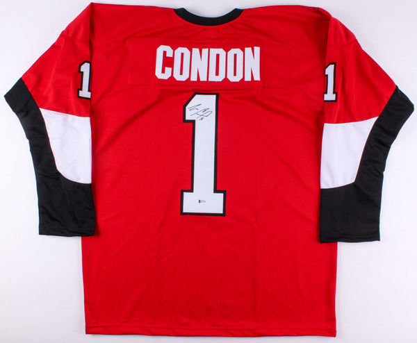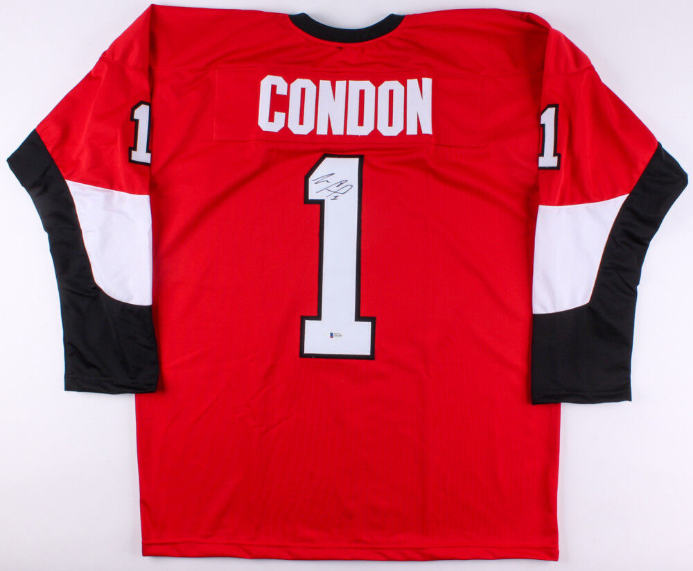 Custom on-ice style jersey. Everything sewn on, size XL. Hand-signed in black felt-tip pen by Mike Condon. The autograph includes an official Beckett Authentication Services serially numbered hologram and matching COA for authenticity purposes.Authentication: Beckett COA