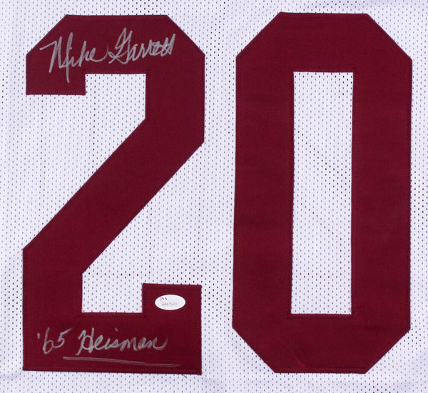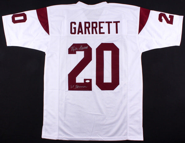 Custom on-field style jersey. Everything is sewn on, size XL. Hand-signed and inscribed in silver paint pen by Mike Garrett. The autograph includes an official James Spence Authentication (JSA) hologram and matching COA for authenticity purposes. The signing of this item was witnessed by JSA.Authentication: JSA COA