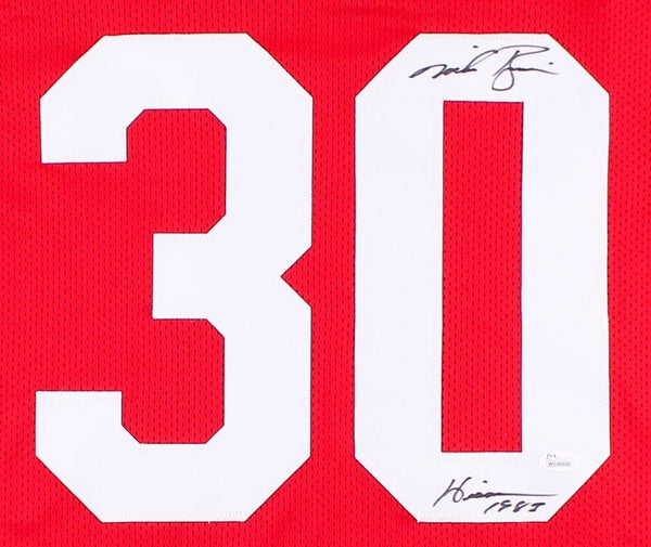 Custom on-field style jersey. Everything is sewn on, size XL. Hand-signed and inscribed in black felt tip pen by Mike Rozier (Houston Oilers, Atlanta Falcons). The autograph includes an official James Spence Authentication (JSA) hologram for authenticity purposes. The signing of this item was witnessed by JSA.Authentication: JSA Hologram