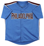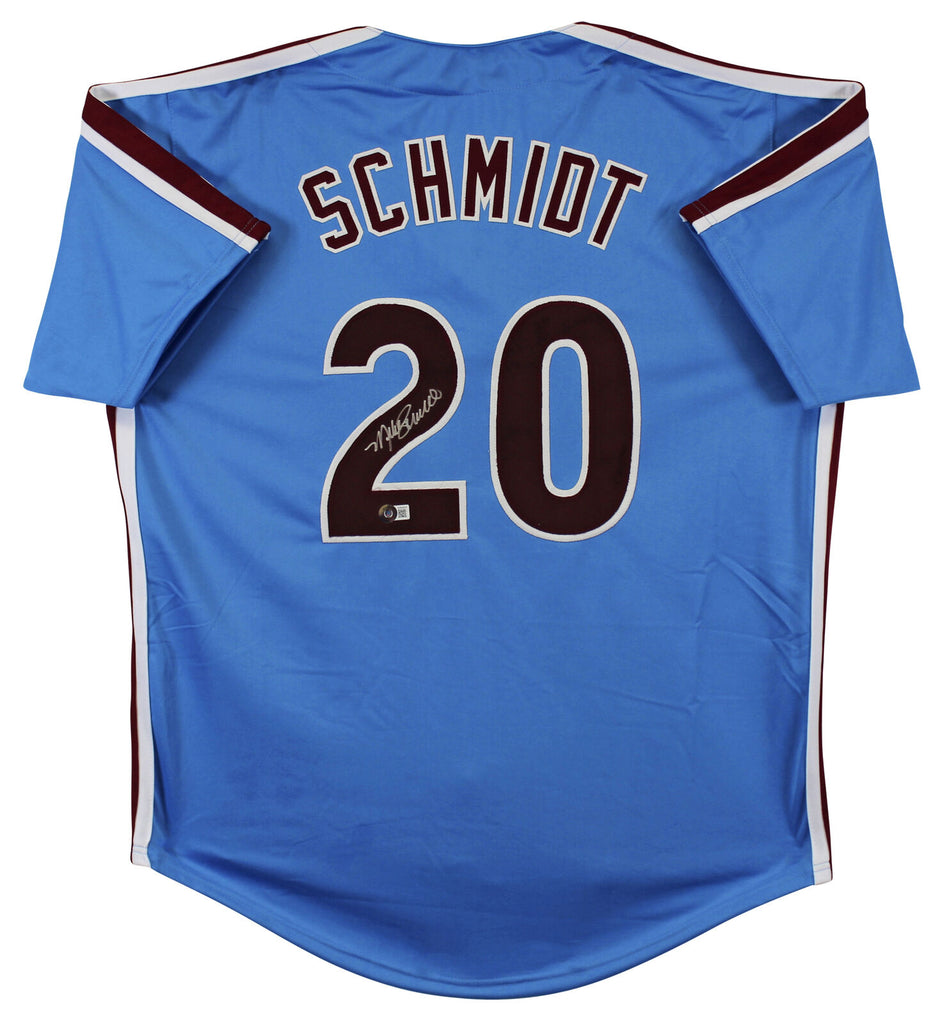This Autographed Light Blue Pro Style Jersey has been Personally Signed by Mike Schmidt of the Philadelphia Phillies. This item is 100% Authentic to include a hologram by Beckett Authentication Services. This item will come with an affixed Beckett Authentication Services (BAS) authentication sticker, which includes a scannable QR code to verify authenticity. Please note that Beckett no longer provides serial-numbered COA cards, and the attached BAS sticker will serve as the complete authentication for this item. We have multiples of this same item. While the photographs are representative of this item, the size, placement and strength of the signature may vary. Each item is hand signed, therefore, each autograph is unique. This is a X-Large sized, non-branded, custom-stitched Jersey.
