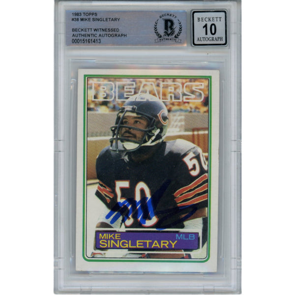 The number in the listing title is just an inventory sku for our records and is not the authentication number. The item pictured is a stock photo unless otherwise noted. This is a Chicago Bears 1983 Topps #38 Slabbed Trading Card with a Grade 10 Auto that was personally autographed by Mike Singletary. Includes a certificate of authenticity from Beckett Authentication Services (BAS) and Denver Autographs.FREE SHIPPING within the USA on orders over $10!
