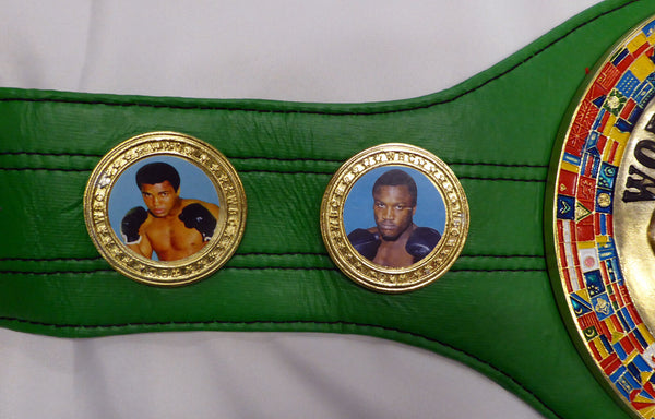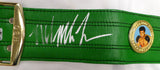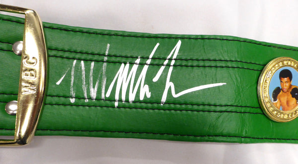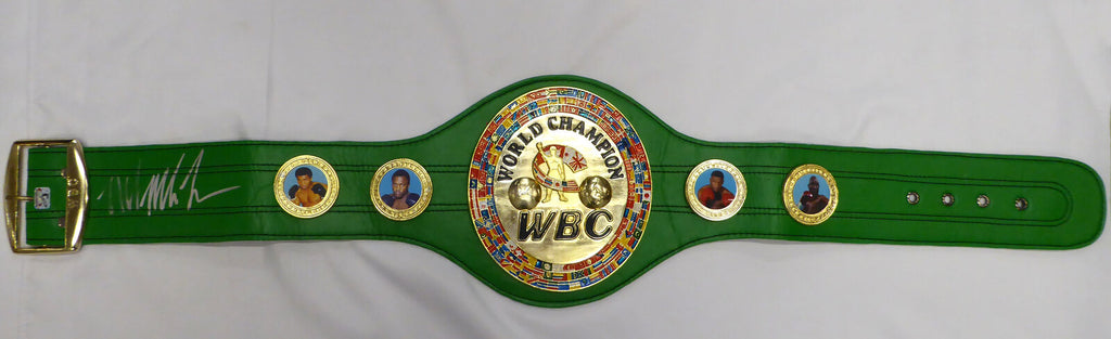 This is aA Green WBC World Championship Belt that has been hand signed by Mike Tyson. Mike started to sign this but the pen was dry, so he resigned it again as shown in the pictures. This item has been certified authentic by Beckett Authentication (BAS) and comes with their tamper-proof QR Code sticker that can be verified on the Beckett-authentication.com.A The belt is approximately 48 inches long by 10 inches tall.