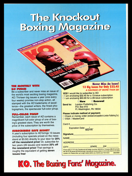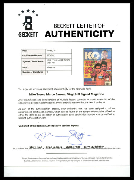 This is a KO magazine that has been hand signed by Mike Tyson, Marco Antonio Barrera & Virgil Hill. This item has been certified authentic by Beckett Authentication (BAS) and comes with their Tamper-Proof Hologram and matching full-page certificate of authenticity.