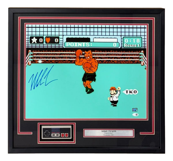 Featured is a Mike Tyson signed 16x20 Punch Out boxing photo. This photo has been hand signed by Tyson and comes with the JSA QR hologram. This photo has been professionally framed and matted with NES controller and is approximately 22x27. This photo would make a great addition to any sports memorabilia collection! SPECIFICATIONS Autographed By: Mike Tyson Team: Sport: Boxing Authentication: James Spence Authentication (JSA)