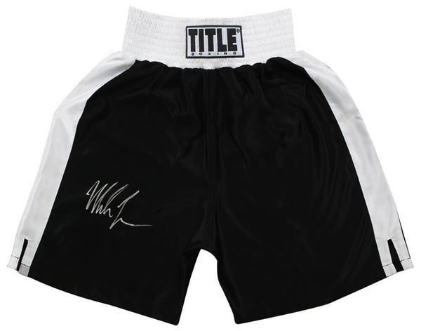 Mike Tyson signed Title black with white trim boxing trunks. Item comes with a Schwartz Sports Memorabilia tamper-proof numbered hologram and Certificate of Authenticity which can be verified online.