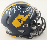 Riddell West Virginia Mountaineers speed mini helmet has been hand-signed and inscribed by Mike Vanderjagt.The autograph includes an official Beckett Authentication Services serially numbered hologram for authenticity purposes. The signing of this item was witnessed by Beckett.Authentication: Beckett Hologram