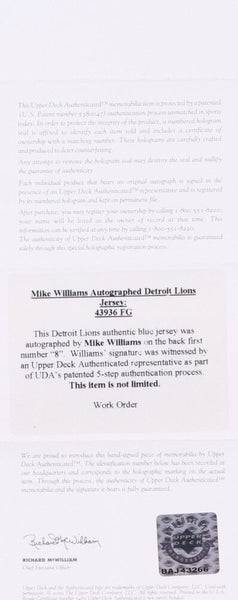 Reebok on field style jersey. Everything sewn on, size 50. Hand-signed in black felt-tip pen by Mike Williams. The lot / autograph(s) includes an official Upper Deck Authenticated (UDA) hologram and matching COA for authenticity purposes.Authentication: UDA COA