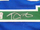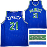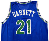 This is a Blue Jersey that has been hand signed by Kevin Garnett. This is a custom jersey with no name brand. The approximate size is XL. It has nice sewn in name and numbers. This item has been certified authentic by Beckett Authentication (BAS) and comes with their tamper-proof QR Code sticker that can be verified on the Beckett-authentication.com.