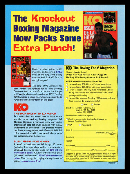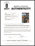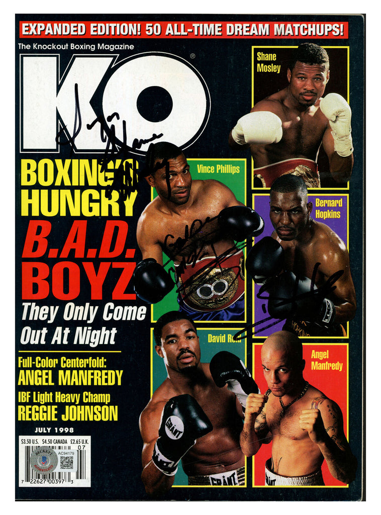 This is a KO Magazine that has been hand signed by Shane Mosley, Bernard Hopkins & Vince Phillips. This item has been certified authentic by Beckett Authentication (BAS) and comes with their tamper-proof hologram and matching full-page certificate of authenticity.