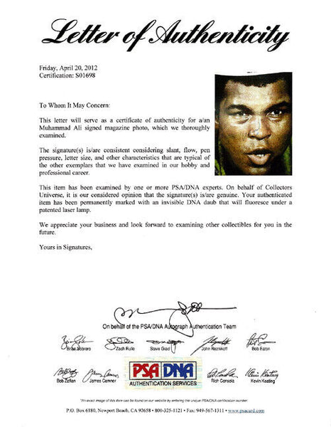 This is a Magazine Page Photo that has been hand signed by Muhammad Ali. It has been certified authentic by PSA/DNA and comes with their sticker and matching full page certificate of authenticity.