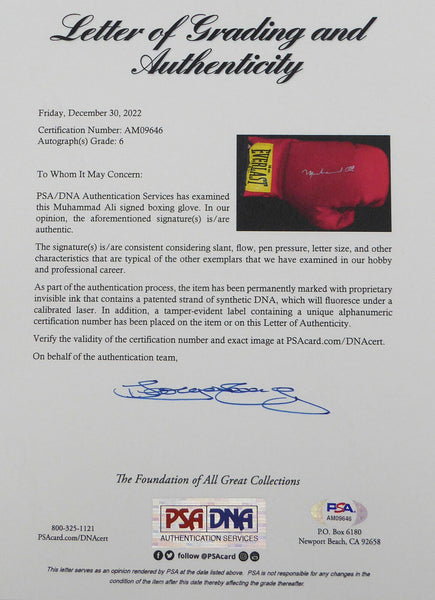 This is a Red Everlast Boxing Gloves that has been hand signed by Muhammad Ali. This item has been certified authentic by PSA/DNA and comes with their tamper-proof sticker and matching full-page certificate of authenticity.