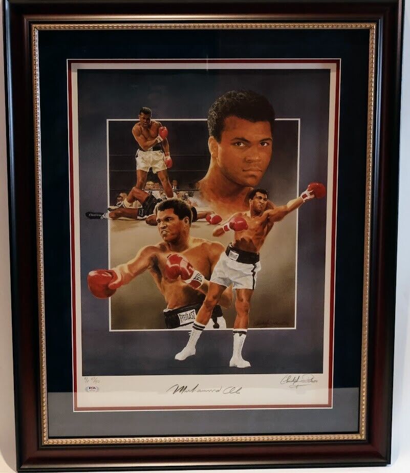 Celebrate the legacy of "The Greatest" with this exquisite Muhammad Ali autographed 32x26 framed photo. This stunning piece captures the legendary boxer's indomitable spirit and iconic presence, making it a must-have for any sports memorabilia collection. Key Features: Authentic Signature: Hand-signed by Muhammad Ali, this photo features a clear and bold autograph, authenticated by PSA/DNA, ensuring its legitimacy. Premium Framing: Encased in a high-quality 32x26 frame, the photo is beautifully presented, ready to be displayed in your home, office, or man cave. Certificate of Authenticity: Comes with both a PSA/DNA Letter of Authenticity (LOA) and a Sports Memorabilia Certificate of Authenticity (COA), providing you with peace of mind and verifying the item's provenance. Iconic Imagery: The photograph captures an unforgettable moment in Ali's illustrious career, making it a timeless piece that resonates with fans and collectors alike. Perfect Gift: Whether for a dedicated Muhammad Ali fan or a collector of sports history, this framed photo is an ideal gift that will be cherished for years to come. Own a piece of boxing history and honor the unparalleled career of Muhammad Ali with this autographed framed photo. Don't miss your chance to add this extraordinary item to your collection today!