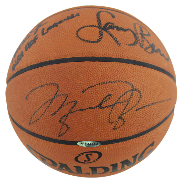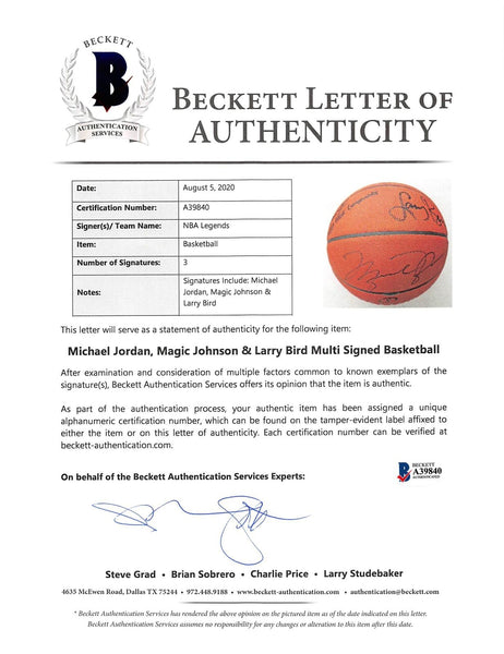 This Autographed Official NBA Game Basketball with the inscription of "NBA HOF Legends (Magic Johnson)" has been Personally Signed by Michael Jordan, Larry Bird & Magic Johnson. This item is 100% Authentic to include a Certificate of Authenticity (COA) / hologram by Beckett Authentication Services. The authenticity can be verified on Beckett Authentication Services website.