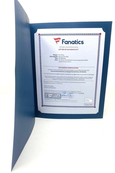 This authentic helmet has been personally hand-signed by Tom Brady. It is officially licensed by the National Football League and comes with an individually numbered, tamper-evident hologram from Fanatics Authentic. To ensure authenticity, the hologram can be reviewed online. This process helps to ensure that the product purchased is authentic and eliminates any possibility of duplication or fraud.