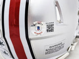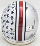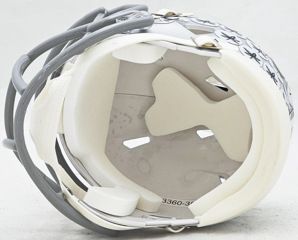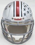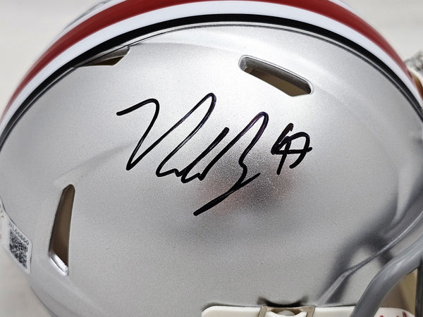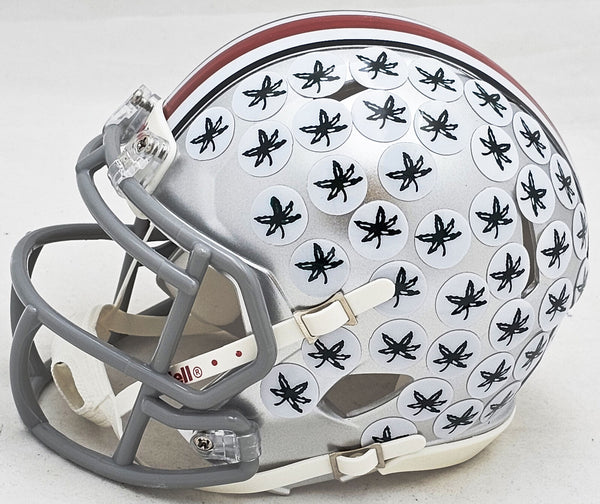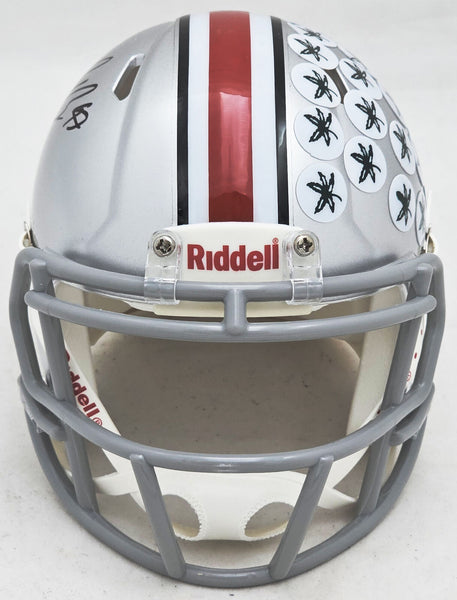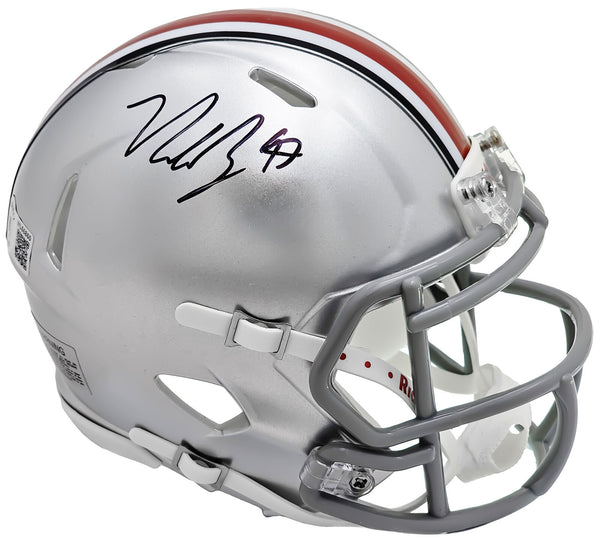 This is an Ohio State Buckeyes Silver Speed Mini Helmet that has been hand signed by Nick Bosa. This item has been witnessed and certified authentic by Beckett Authentication (BAS) and comes with their tamper-proof witness sticker.