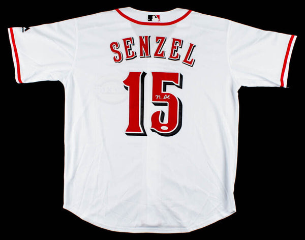 Custom on field style jersey with everything sewn on, size XL. Jersey has been hand-signed in silver felt-tip pen by Nick Senzel. (Cincinnati Reds) The lot / autograph(s) includes an official James Spence Authentication (JSA) hologram and matching COA for authenticity purposes. The signing of this item was witnessed by JSA.Authentication: JSA COA