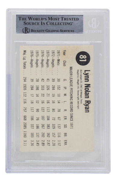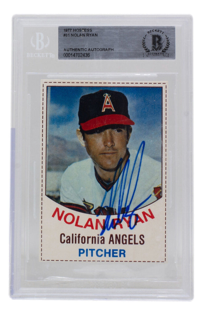 Featured is a Nolan Ryan signed 1977 Hostess Californias Angels baseball card #81. This card was hand signed by Nolan Ryan and has been slabbed and authenticated by Beckett authentication services. This item would make a great addition to any sports memorabilia collection. SPECIFICATIONS Autographed By: Nolan Ryan Team: California Angels Sport: Baseball Authentication: Beckett Grading Services