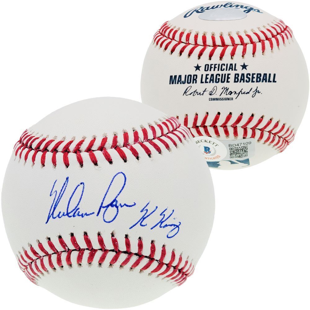 Featured is a Nolan Ryan signed Rawlings official baseball, inscribed "K-King". This ball has been hand signed by Ryan and comes with the Beckett hologram and certificate of authenticity. This ball would make a great addition to any sports memorabilia collection!. SPECIFICATIONS Autographed By: Nolan Ryan Team: Texas Rangers Sport: Baseball Authentication: Beckett Grading Services