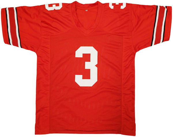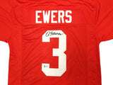 This is a Red Jersey that has been hand signed by Quinn Ewers. This is a custom jersey with no name brand. The approximate size is XL. It has nice sewn in name and numbers. This item has been witnessed and certified authentic by Beckett Authentication (BAS) and comes with their tamper-proof witness sticker.