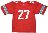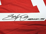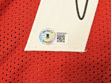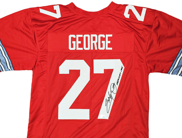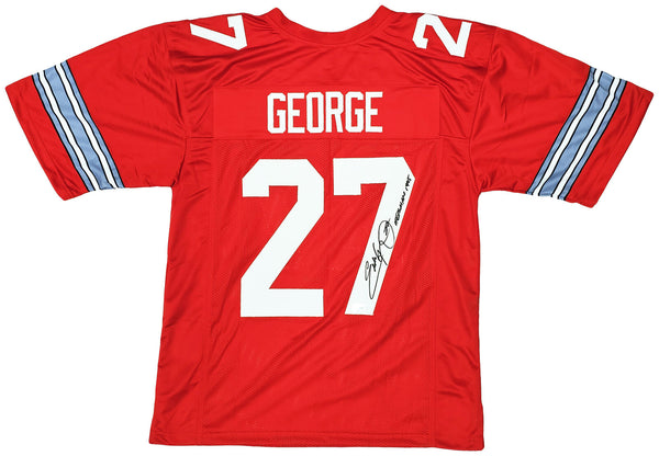 This is a Red Jersey that has been hand signed by Eddie George. This jersey is specially made without any recognizable brand. It is approximately sized as XL and features well-stitched name and numbers. This item was inscribed "Heisman 1995." This item has been witnessed and certified authentic by Beckett Authentication (BAS) and comes with their tamper-proof witness sticker. Beckett Authentication has recently changed their physical certificate card policy where they no longer match their tamper-proof sticker with a physical certificate. A certificate can be printed on Beckett's website for the matching authentication number.